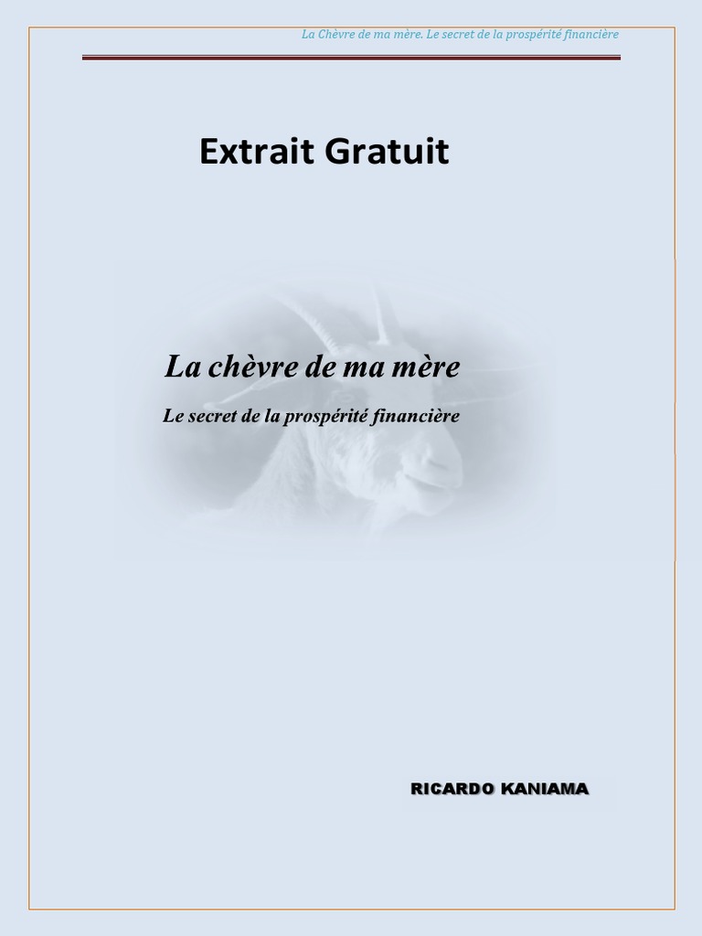 La chevre de ma mere livre pdf gratuit. Pas a pas ricardo kaniama montre au lecteur comment gravir dune marche a lautre les escaliers qui conduisent au succes materiel. Il est tout a fait possible de sortir de la pauvreteen partant de rien. Cest un guide sure le chemin de la reussite materielle et de lautonomie financiere. Ce petit livre est plus quun livre cest un grand tresor.